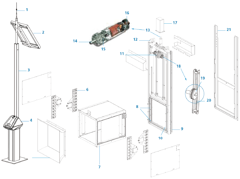 箱涵式測控一體化板閘流量計由測流箱(16對超聲波探頭)、閘板、閘框、控制臺、天線桿、太陽能板組成。